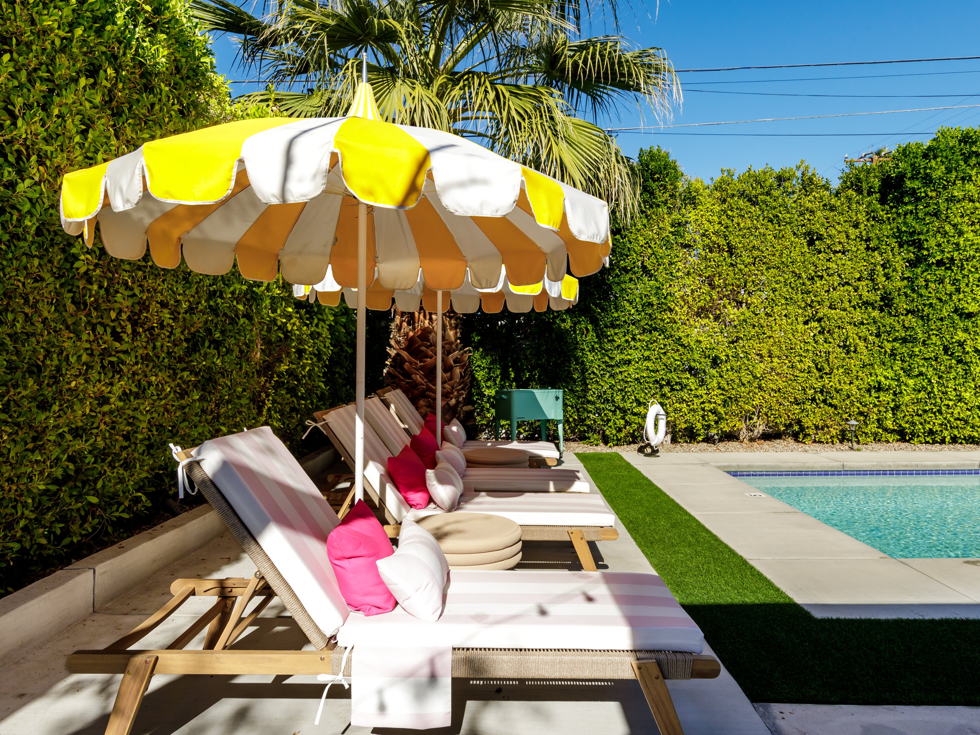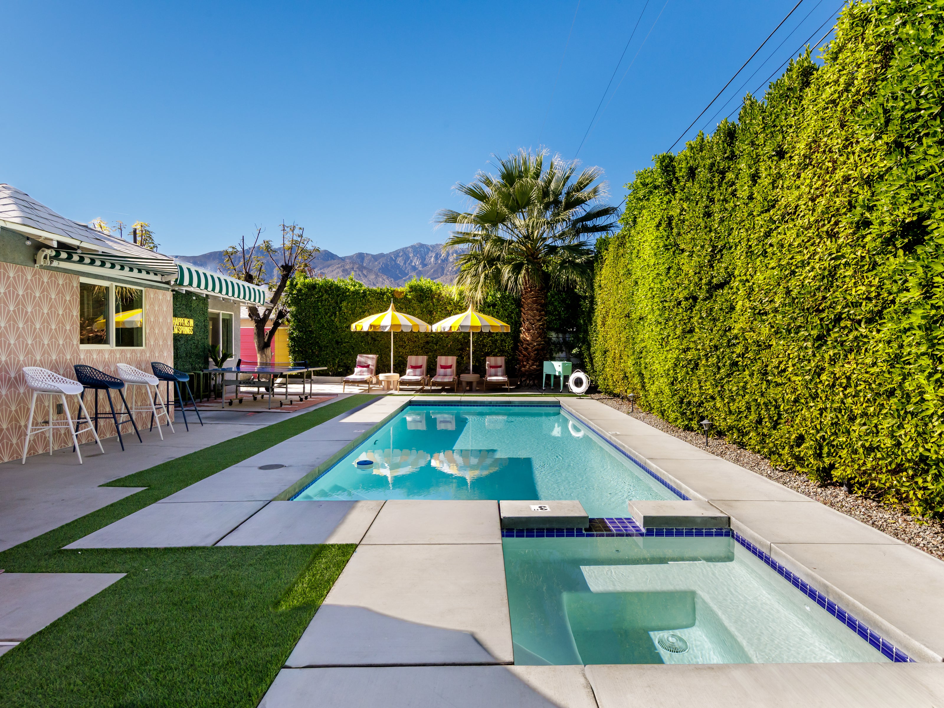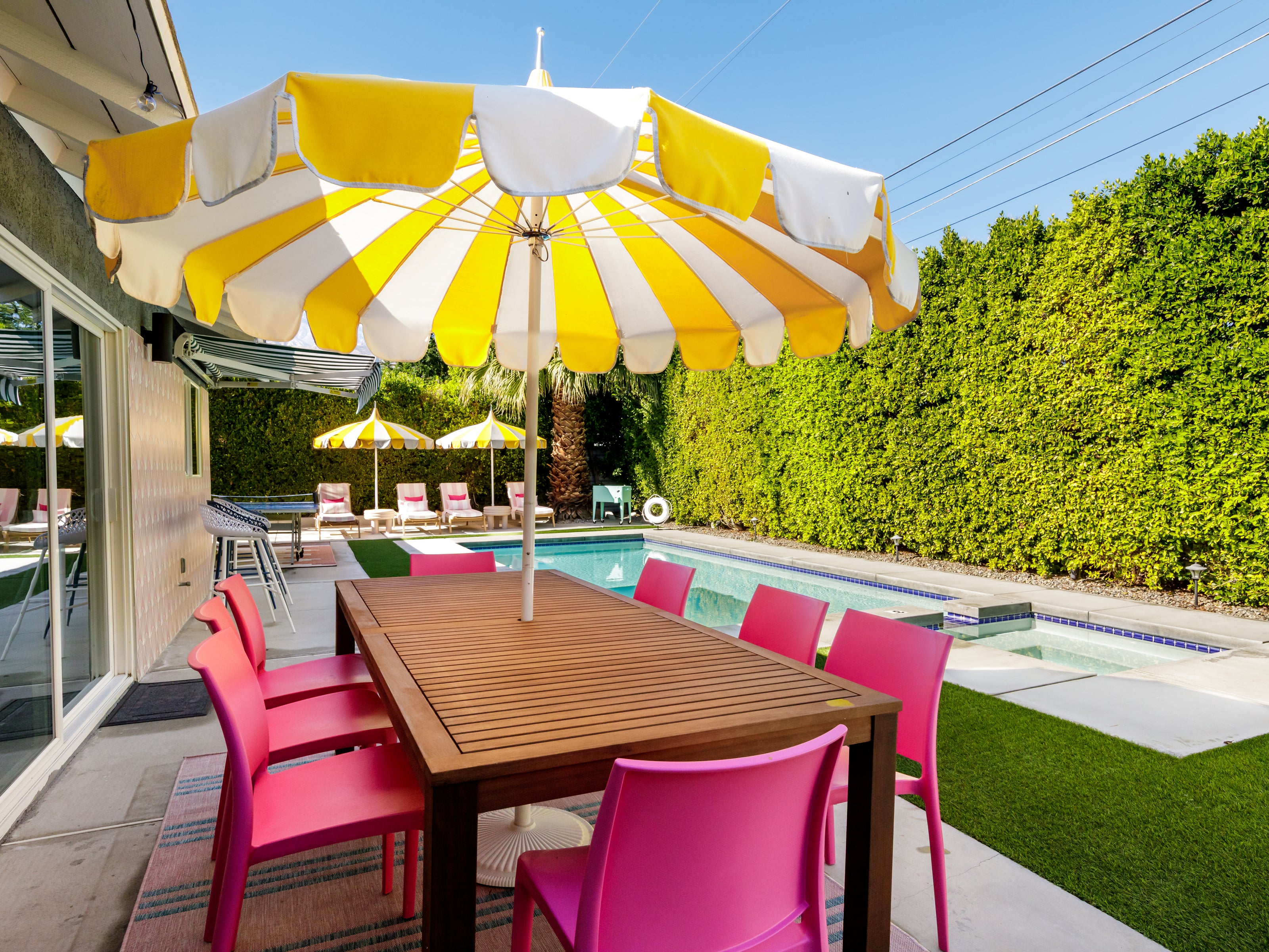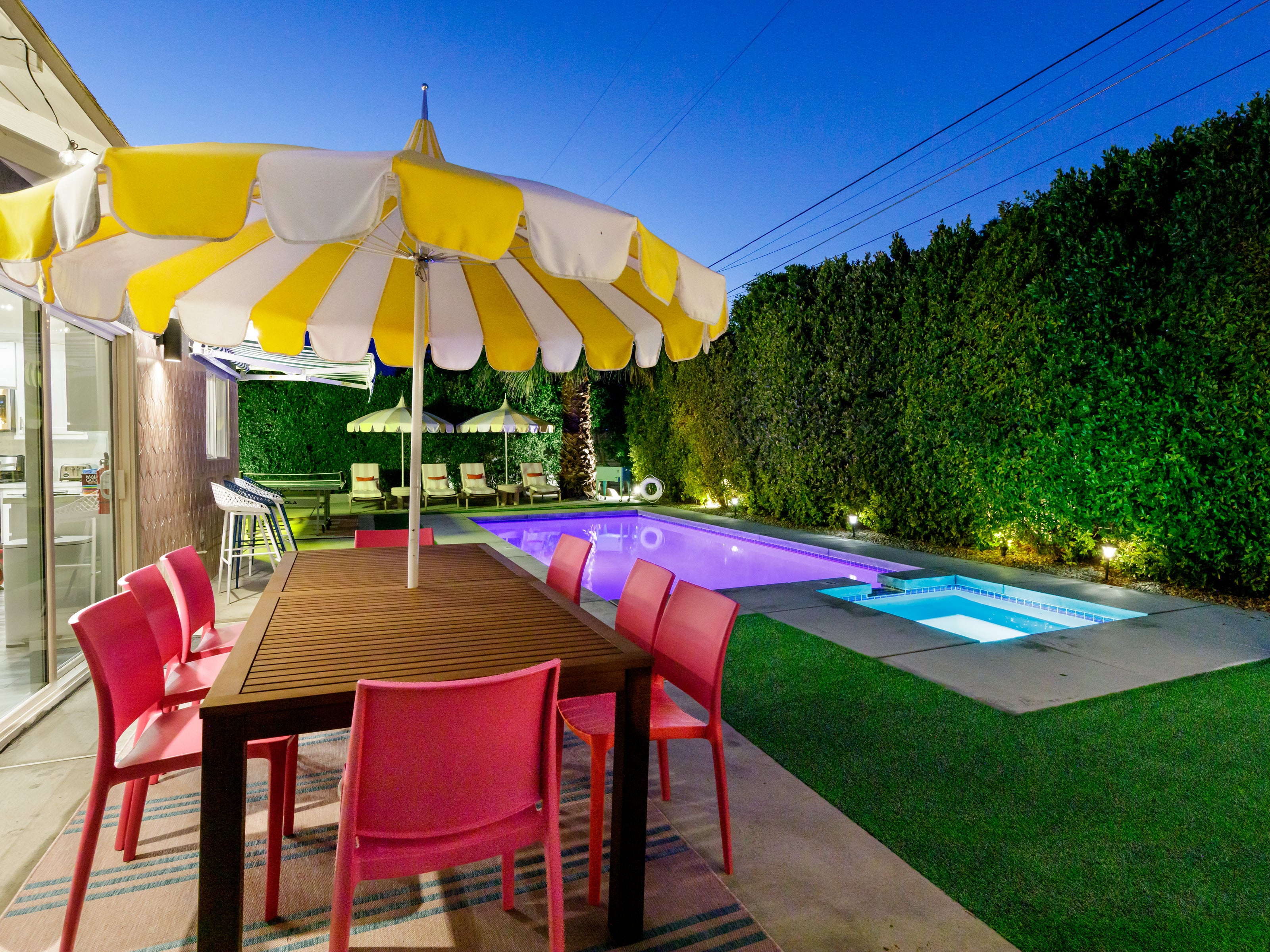 We refreshed the space with a vibrant palette, a newly painted fence, layered lighting, and thoughtful styling details. The yard was strategically zoned around the existing pool to maximize flow and functionality. Vibrant throw pillows, curated decor, and an eye-catching neon sign behind the ping pong table (reading Sip Happens in Palm Springs) added energy and multiple photo-worthy moments for guests to snap and post.